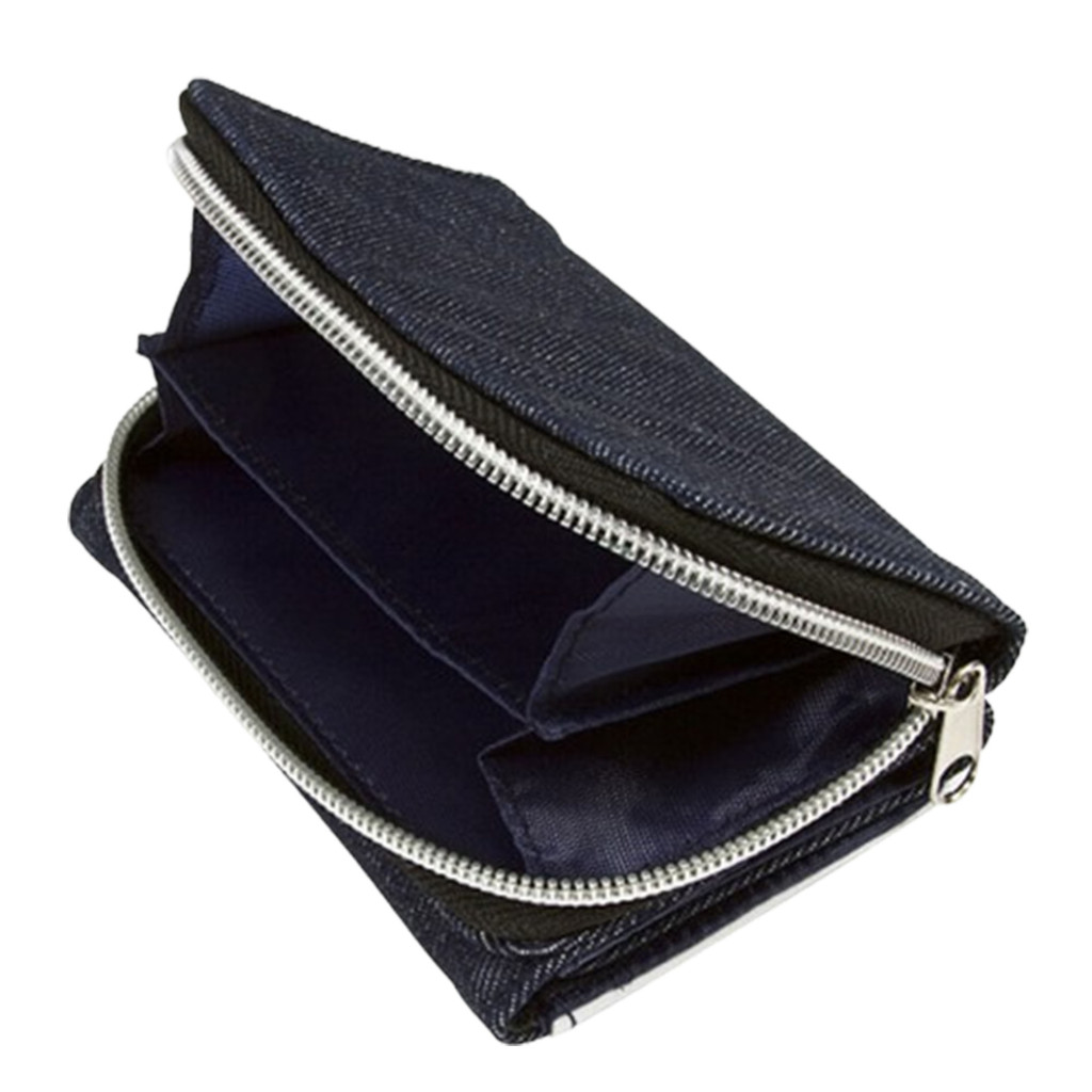 Stílusos és strapabíró sötétkék farmer pénztárca egyedi mintákkal, kifejezetten a kártyák, papírpénz és aprópénz praktikus tárolására tervezve.